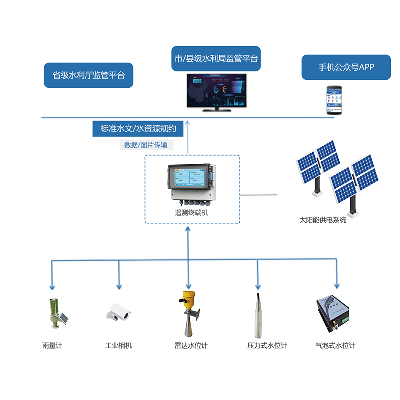 水雨情自動監測系統用于水利管理部門遠程監測水庫、河道、灌區、堰閘等水利設施的水位、降雨量的實時數據, 同時支持遠程圖像監控,為保障水庫的適度蓄水和安全度汛提供了準確、及時的現場信息。
