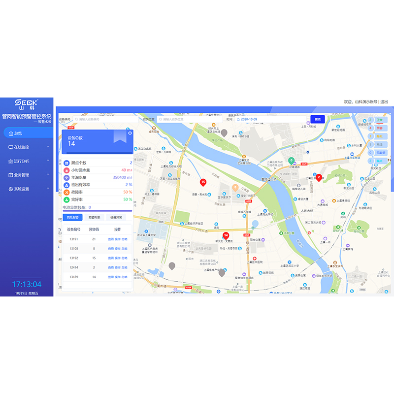山科智慧水務平臺是對水務領域進行感知物聯、集成分析、智能決策和展示執行的一體化解決方案及系統,實現水務營運的整體掌控,確保水務運行安全,降低水務運行漏損及成本,提升人員效益和水務設施壽命,提高水務經營管理 的核心能力。